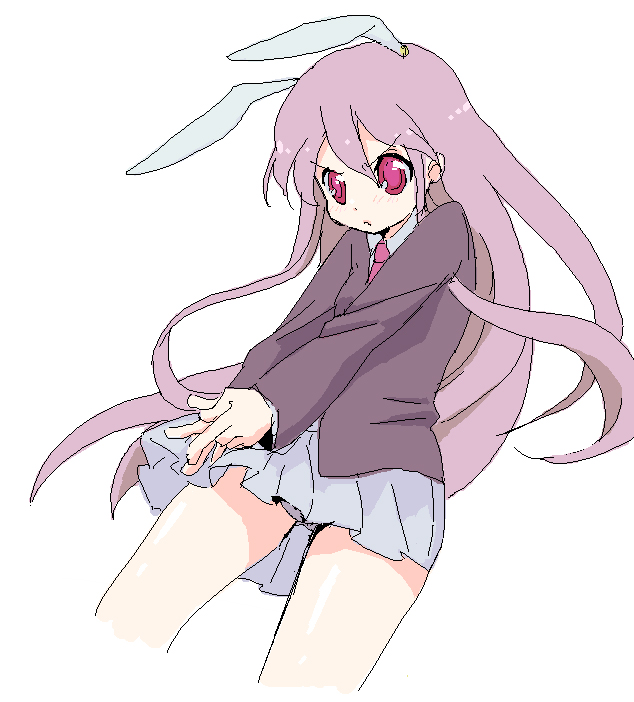 1girlanimal earsfemale focusfinger gunlong hairnecktieoekakipantiespantyshotpurple hairrabbit earsred eyessimple backgroundskirtsolounderwearwhite background