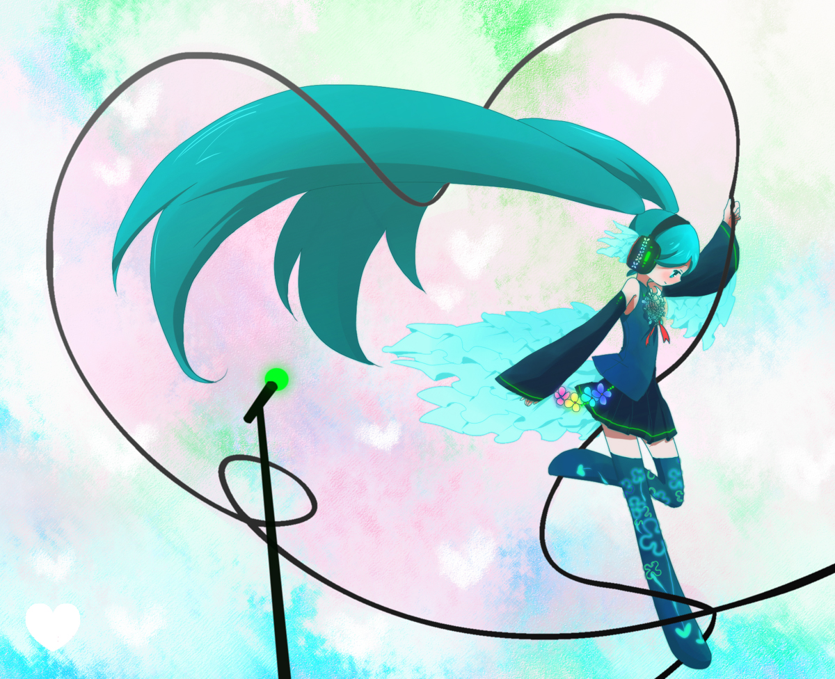 detached sleevesgreen eyesgreen hairheadphonesheartlong hairmicrophonemicrophone standskirtsolothighhighstwintails