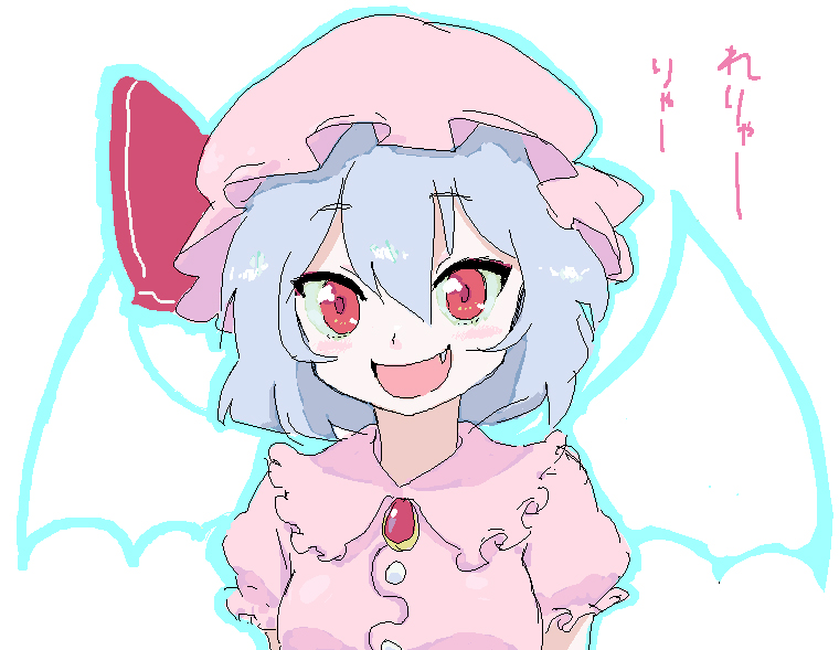 1girlblue hairfangfemale focushatred eyesshort hairsimple backgroundsmilesoloupper bodyvampirewhite backgroundwings