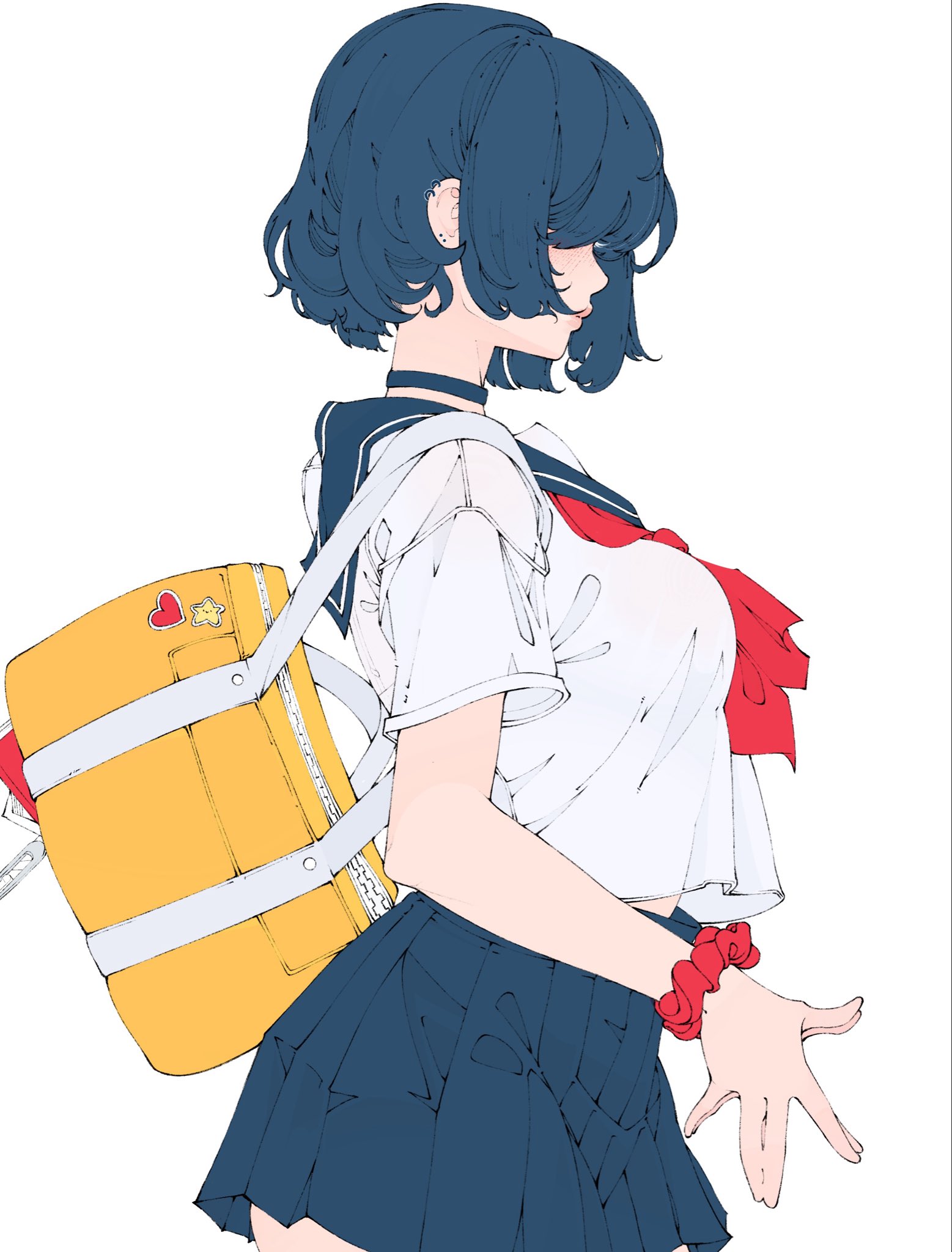 1girlblue chokerblue hairblue sailor collarblue skirtbreastschokerclosed mouthcowboy shotear piercingfrecklesfrilled braceletfrom sidelarge breastslipsmidriff peekneckerchiefnosepalms togetherpiercingpleated skirtprofilered neckerchiefsailor collarschool uniformserafukushirtshort hairshort sleevessimple backgroundskirtsolothighswhite backgroundwhite serafukuwhite shirtyellow bag