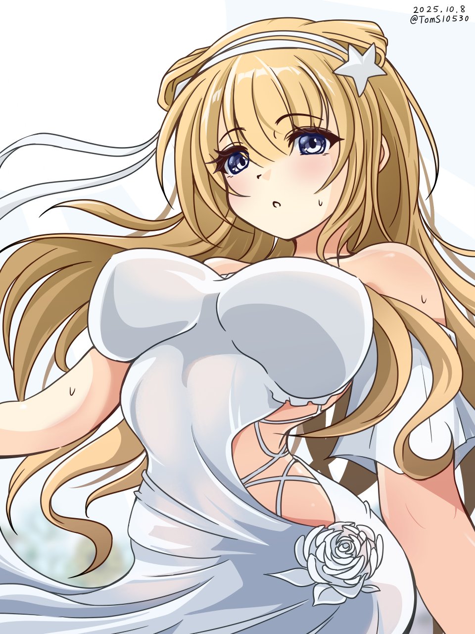 1girlblonde hairblue eyesbreastsclothing cutoutcowboy shotcross-laced clothescross-laced cutoutdouble bundressflowerfolded hairhair bunhair ornamenthairbandlarge breastslong hairmulti-strapped dressofficial alternate costumeone-hour drawing challengerosesolostar (symbol)star hair ornamentwhite dresswhite flowerwhite hairbandwhite rose