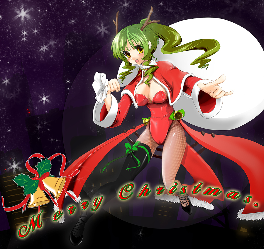 1girlantlerschristmasfemale focusfishnet pantyhosefishnetsgreen hairhornsleotardlong hairnontraditional playboy bunnypantyhoseplayboy bunnyred leotardsanta costumesoloyellow eyes