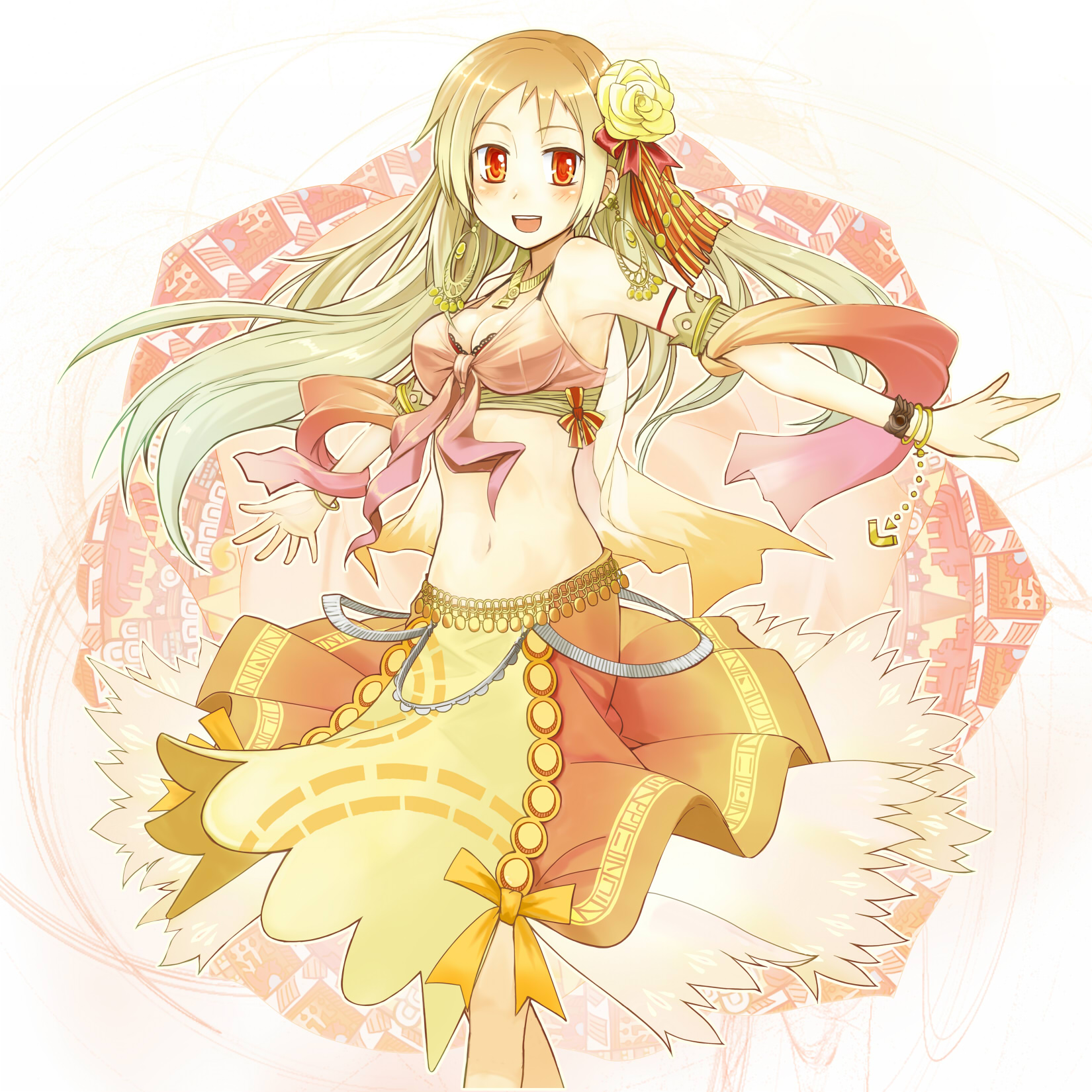 highres, blonde hair, loli, midriff, panties, red eyes, short twintails, thighhighs, twintails, underwear