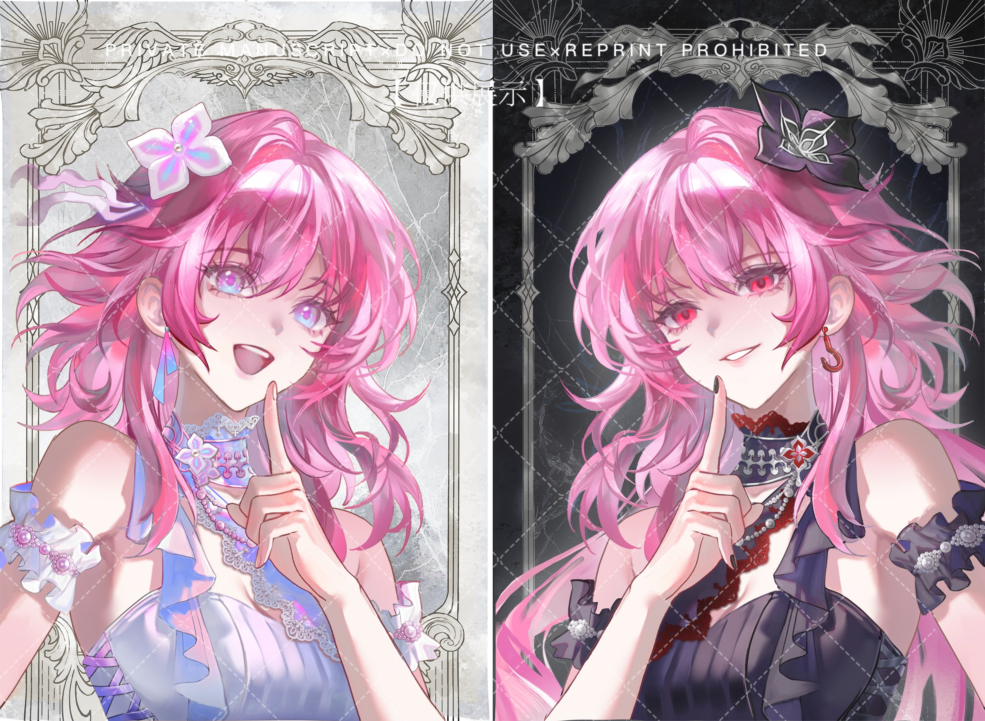2girlsalternate costumebare shouldersdual personaearringsenglish textfinger to mouthflowerfrillshair between eyeshair flowerhair ornamentjewelrylong hairmulticolored eyesmultiple girlspink hairred eyesshushingsingle earringsmileteethtwo-tone eyesupper bodyupper teeth only