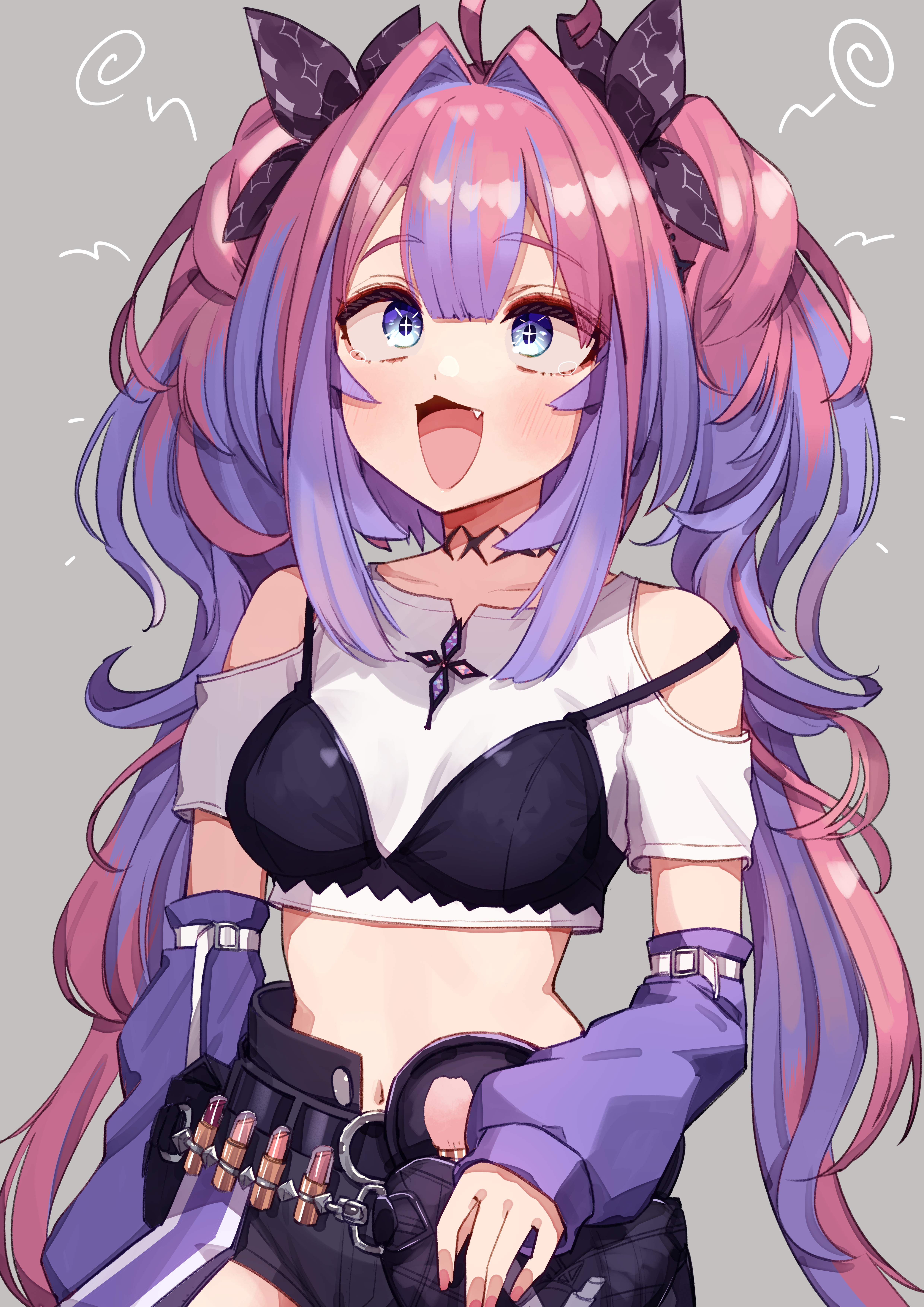 1boy1girlahogebare shouldersblack brablack shortsblue eyesblushbrabra over clothesbreastscollarbonecosmeticsfangfingernailshair intakeslipstick tubelong hairlong sleevesmulticolored hairnail polishnavelopen mouthpink hairpink nailspurple hairshirtshort sleevesshortssimple backgroundsmilesolostomachtwintailstwo-tone hairunderwearvirtual youtuberwhite shirt