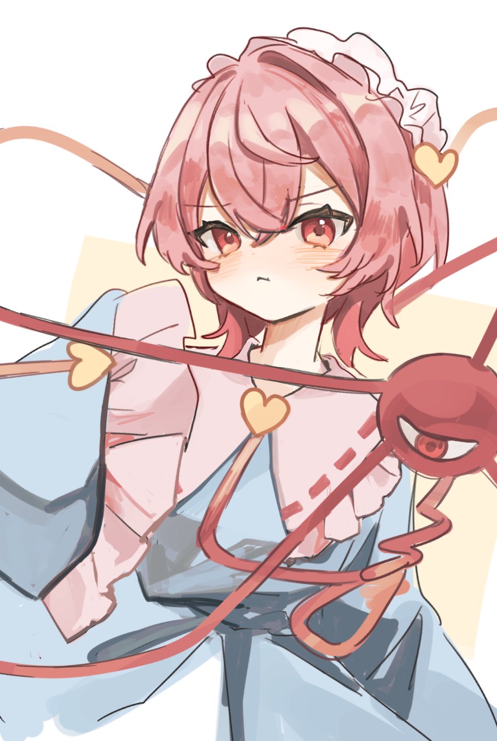 1girlalternate headwearblue shirtblushdot nosedouble-parted bangseyeballfrilled hairbandfrilled shirt collarfrillshair between eyeshair ornamenthairbandhand upheartheart hair ornamentlong sleeveslooking at viewerpink hairpoutred eyesshirtshort hairsimple backgroundsolothird eyev-shaped eyebrowswhite backgroundwide sleeves