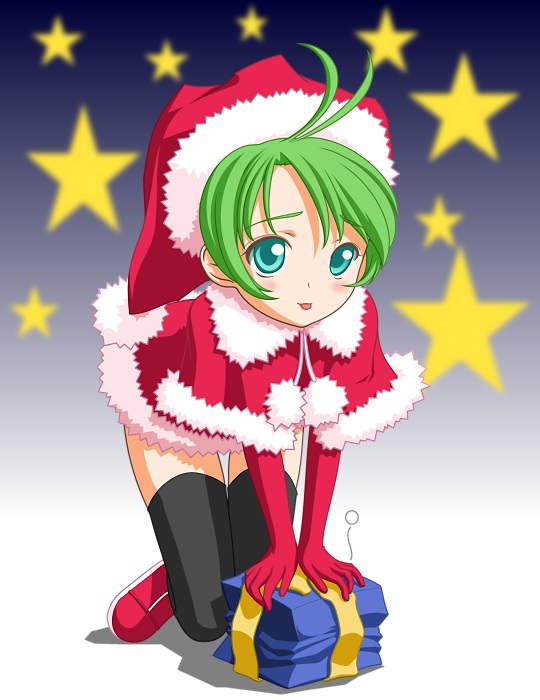 :p1girlblue eyescapeletfemale focusfull bodygiftgradient backgroundgreen eyesgrey backgroundkneelingsanta costumesolothighhighstonguetongue outwhite background