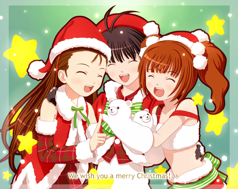 ito noizi, akihime sumomo, yuki-chan, nanatsuiro drops, 00s, 5girls, bell, belt, bikini, blonde hair, blue eyes, blush, brown eyes, brown hair, candy, cat, chibi, christmas, flower, food, hair over one eye, halloween, multiple girls, pink hair, red eyes, red hair, santa costume, swimsuit, thighhighs, wardrobe malfunction
