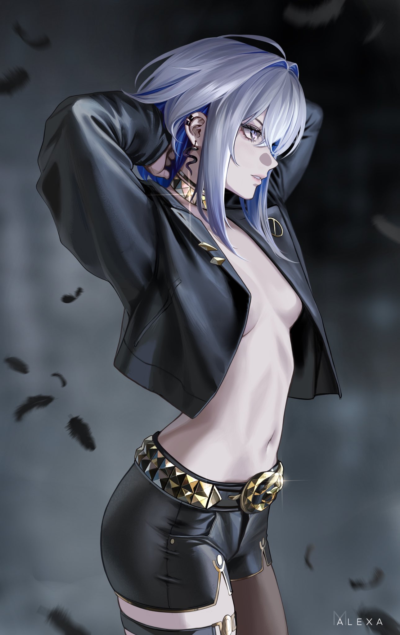 arms upartist nameblack feathersblack jacketblack pantyhoseblack shortsblue haircowboy shotearringsfeathersfrom sidegold chokergrey hairjacketjewelrylooking aheadmedium hairnavelno brapantyhoseparted lipspurple eyesshortssingle leg pantyhosestomachthigh strapthighs