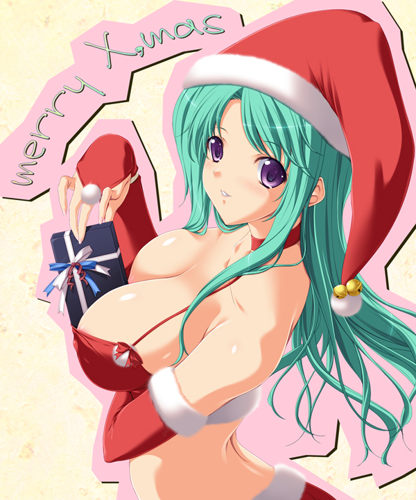 1girlbetween breastsbikinibikini top onlybreastschristmaselbow glovesfemale focusgiftglovesgreen hairhatlarge breastspurple eyesred glovessanta hatsoloswimsuit