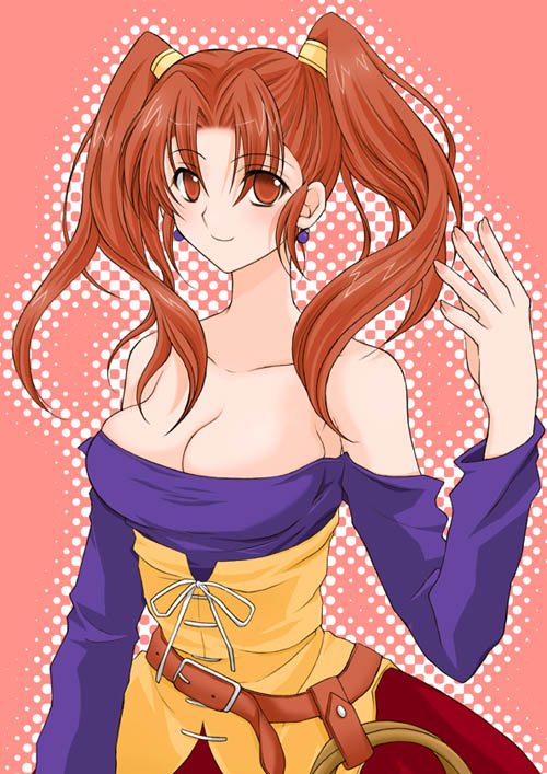 1girlbare shouldersbreastscleavagedressfemale focuslarge breastsoff shoulderpurple shirtshirtsolostraplessstrapless dresstwintails