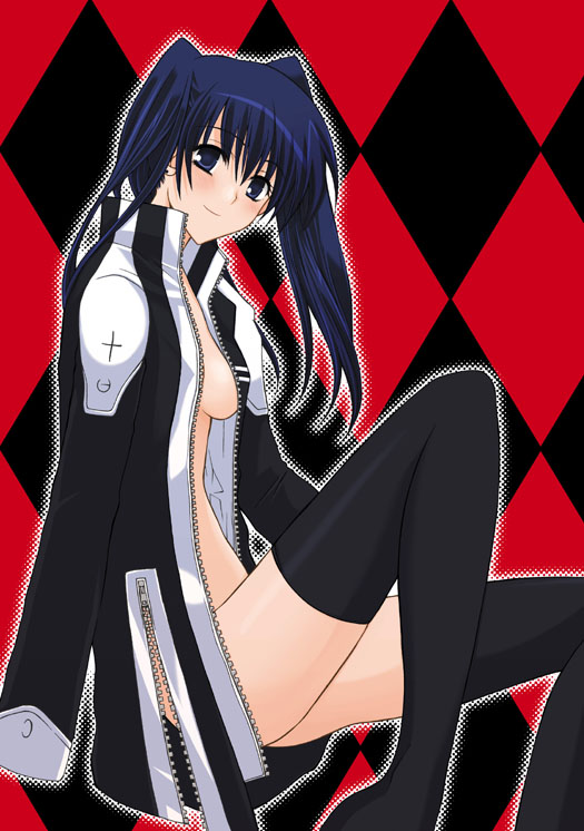 00s1girlargyle backgroundargyle clothesblack thighhighsblue hairblushbraidbreastscleavagefemale focuslong hairlooking at viewermidriffnavelno braopen clothesopen shirtred eyesshirtsingle braidsolostomachthighhighsthighstwintailszettai ryouiki