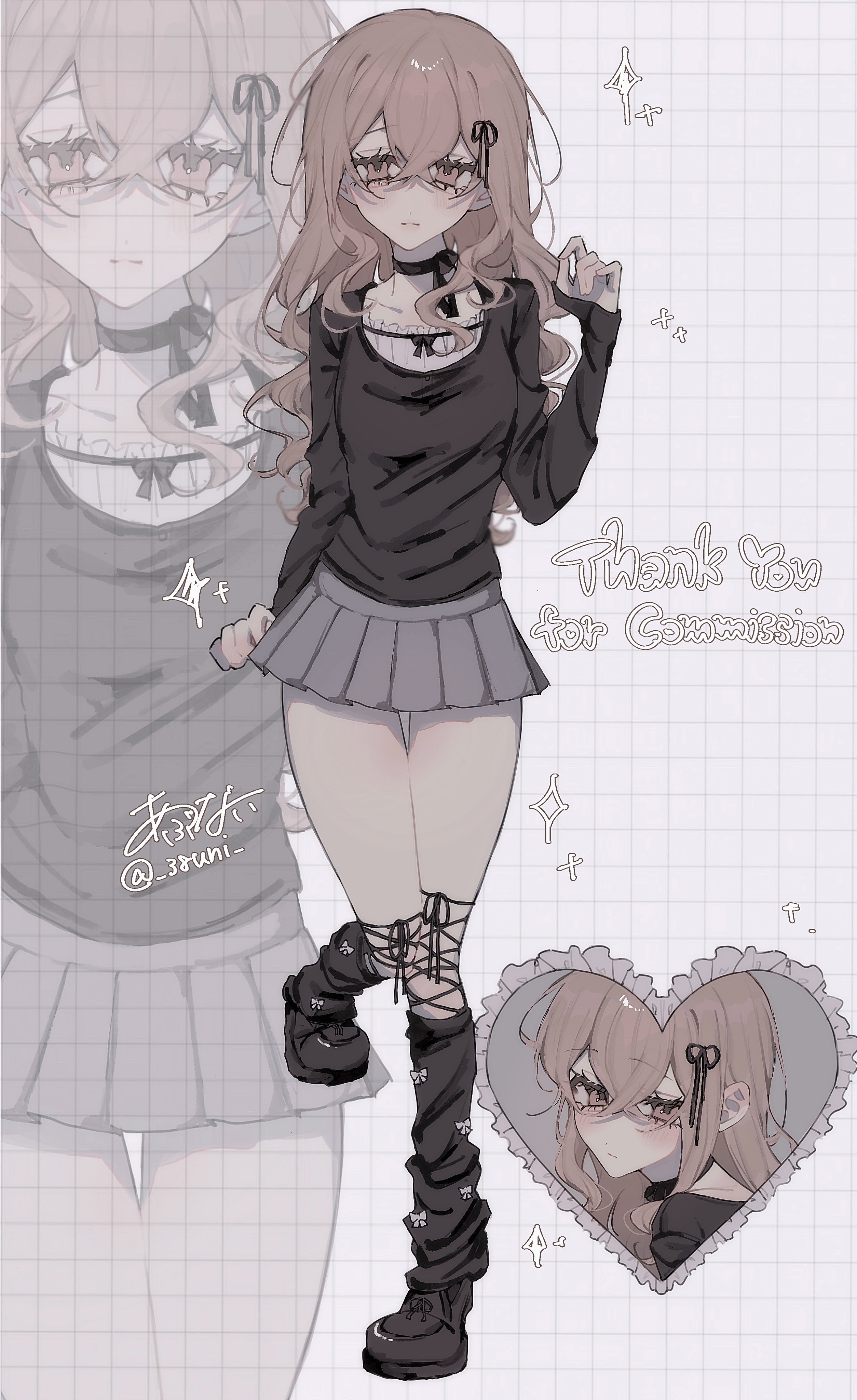 1girl38uiiblack sweaterbrown hairfull bodygrid backgroundheart frameleg uploose socksminiskirtpale skinpink eyessignatureskirtsockssolosweaterthank youtwitter usernamewavy hair