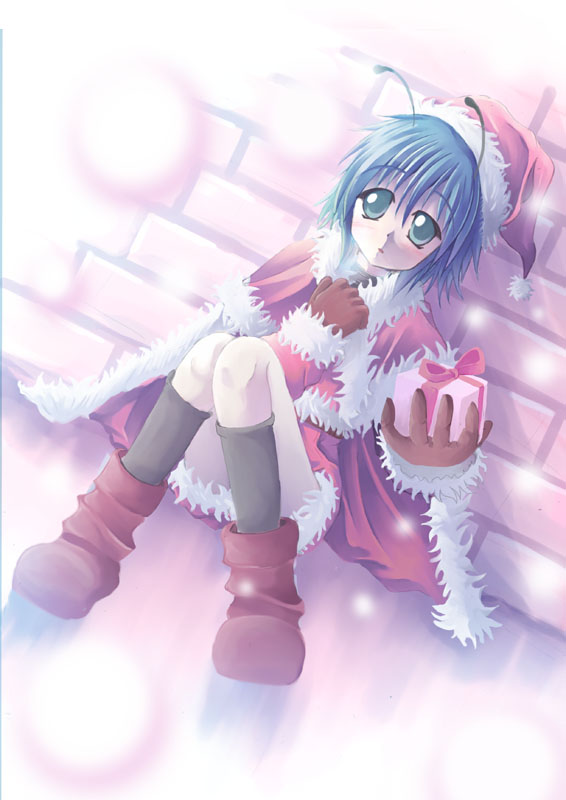 1girlantennaechristmasfemale focusgiftglovesgreen eyesgreen hairmatching hair/eyessanta costumeshort hairsittingsnowsolo