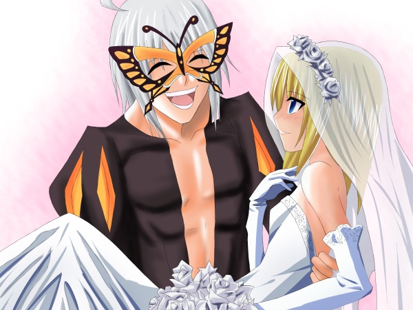 1boy1girlbare shouldersblonde hairblue eyesblushbouquetbreastsbridebutterfly maskcarryingclosed eyescosplaycoupledomino maskdresselbow glovesflowerglovesgrey hairhappyheterolaughingmaskopen mouthpapillon (cosplay)princess carryroseshort hairsmall breastssmileveilwedding dresswhite dresswhite flowerwhite gloveswhite rose