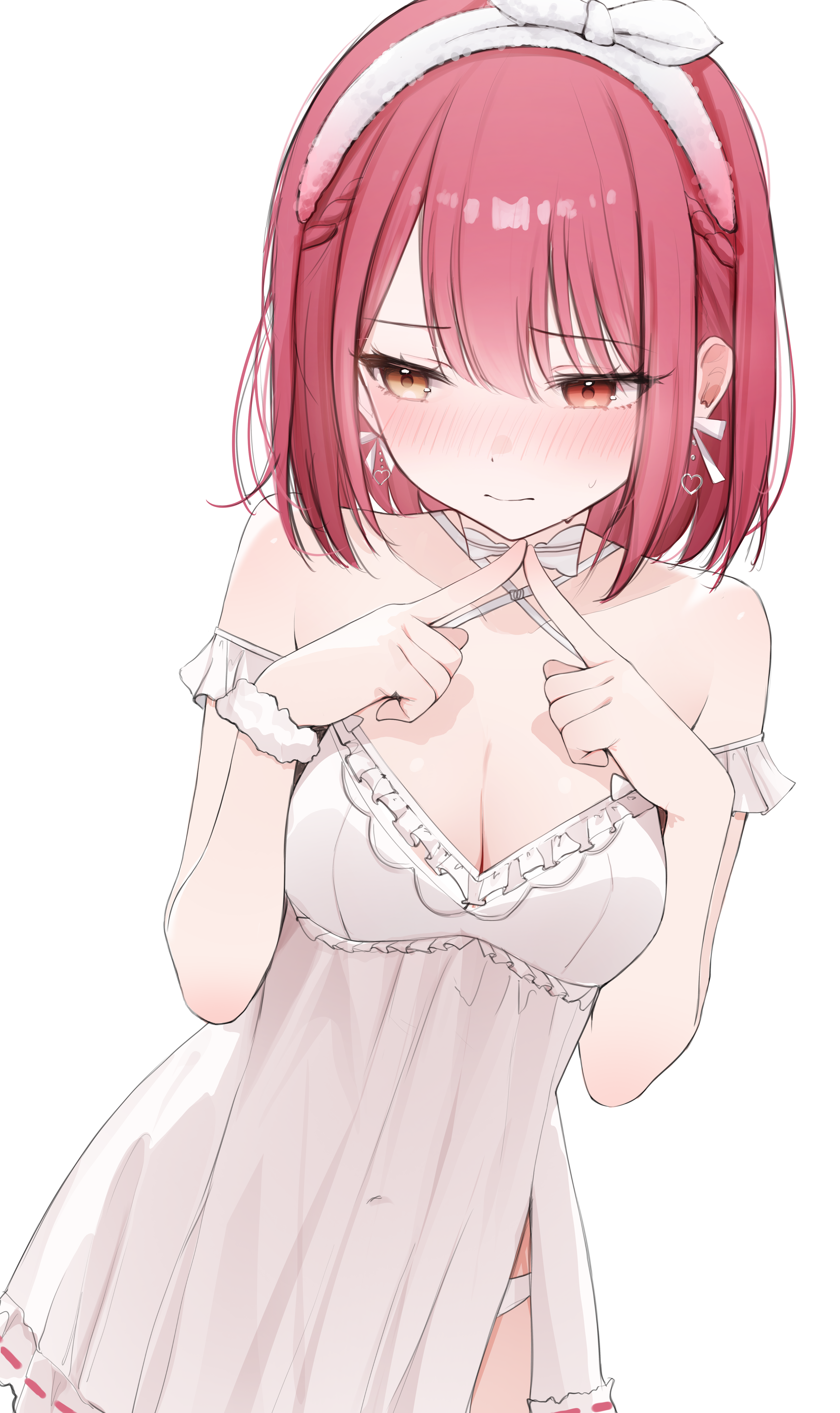 1girlbare shouldersblushbraidbreastschokercleavageclosed mouthcollarboneearringshair scarfheartheart earringsheterochromiaindex fingers togetherjewelrylarge breastslooking to the sidemedium hairnightgownpantiesred eyesred hairribbonribbon earringsscarfscrunchieside slitsimple backgroundsolothighsunderwearvirtual youtuberwhite backgroundwhite chokerwhite nightgownwhite pantieswhite ribbonwhite scarfwhite scrunchiewrist scrunchieyellow eyes