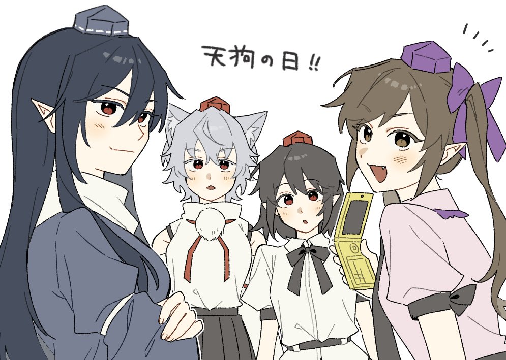 4girlsanimal earsblack bowblack bowtieblack skirtblue dressblue hairblue hatblushbowbowtiebreastsbrown eyesbrown haircellphoneclosed mouthcollared shirtdetached sleevesdressfangflip phonegrey hairhair between eyeshatholdingholding phonelong hairlooking at viewermultiple girlsnecktieopen mouthphonepink shirtpleated skirtpointy earspom pom (clothes)puffy short sleevespuffy sleevespurple hatred eyesred hatshirtshort sleevesskirtsmiletokin hattwintailswhite shirtwolf earswolf girl