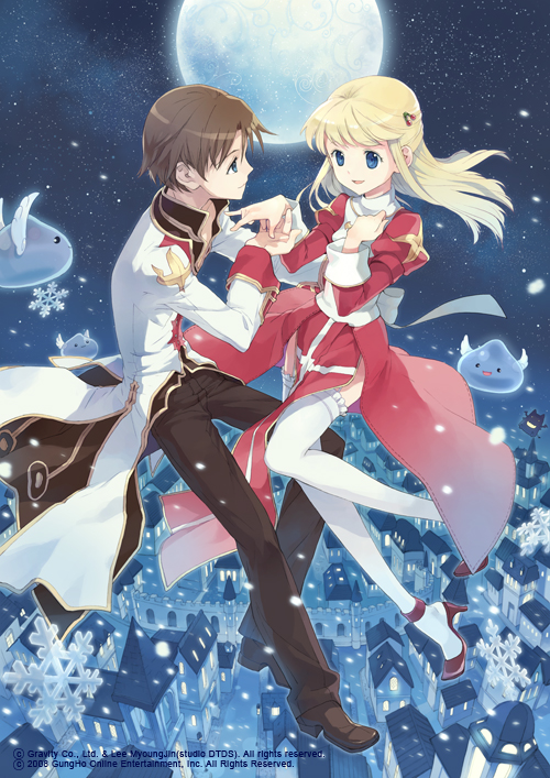 1boy1girlblonde hairblue eyesdressfloatinglegsmoonskyslime (creature)smilesnowstar (sky)star (symbol)starry skythighhighstwo-tone dress