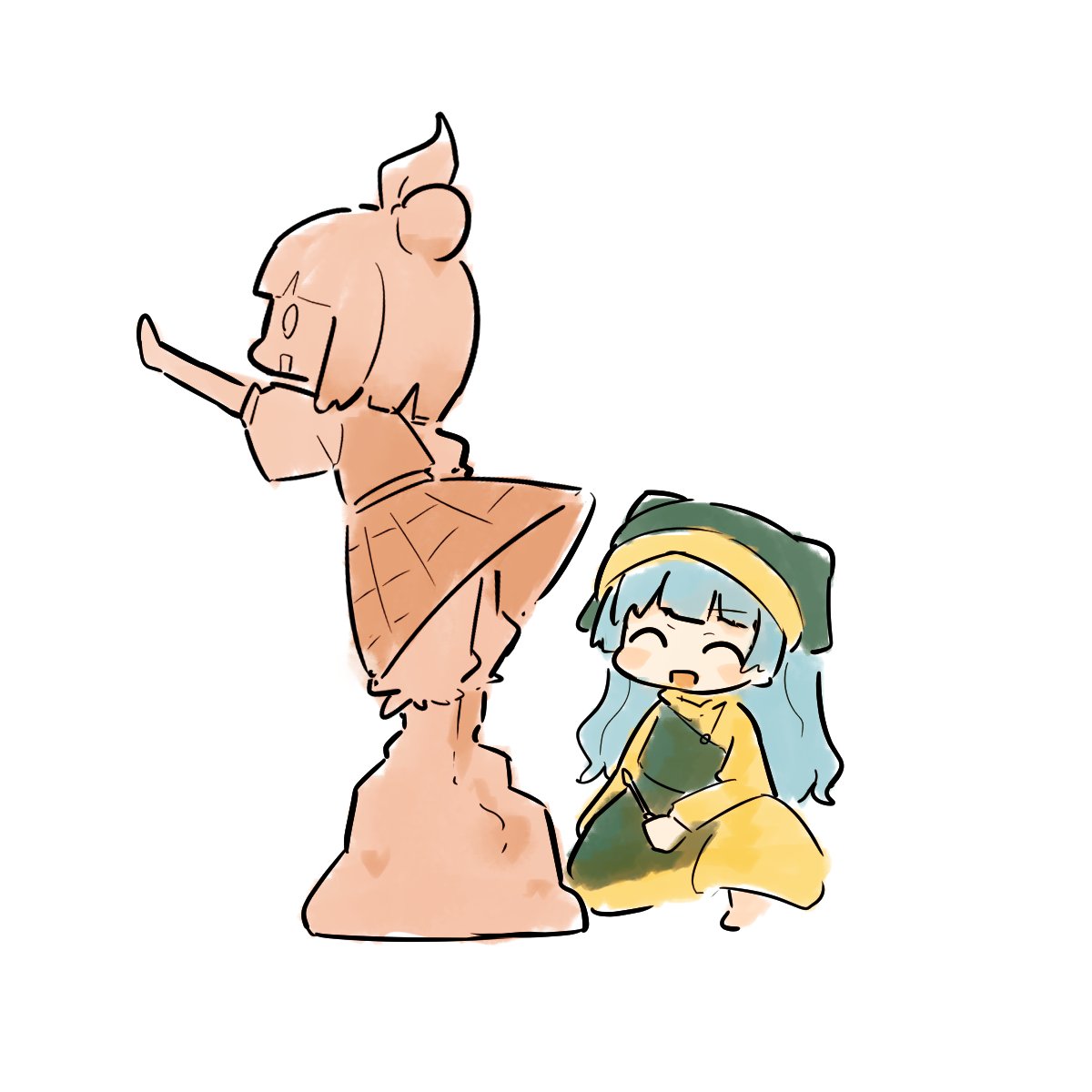 1boy1girlapronblue hairclosed eyesdressfull bodygreen aprongreen headscarfheadscarflong hairopen mouthsimple backgroundsolostatuewhite backgroundyellow dress