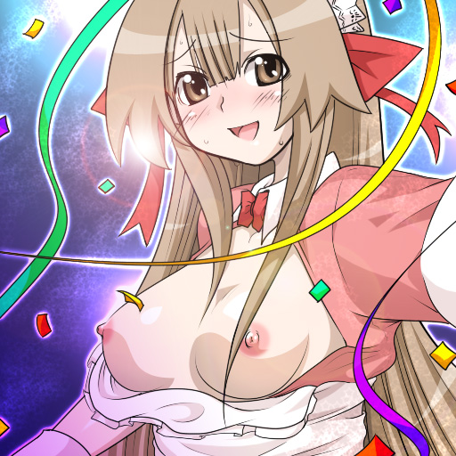 00s1girlblushbowbreastsbrown eyesbrown hairfemale focushair bowlarge breastslong hairnipplesno braopen clothessmilesolo