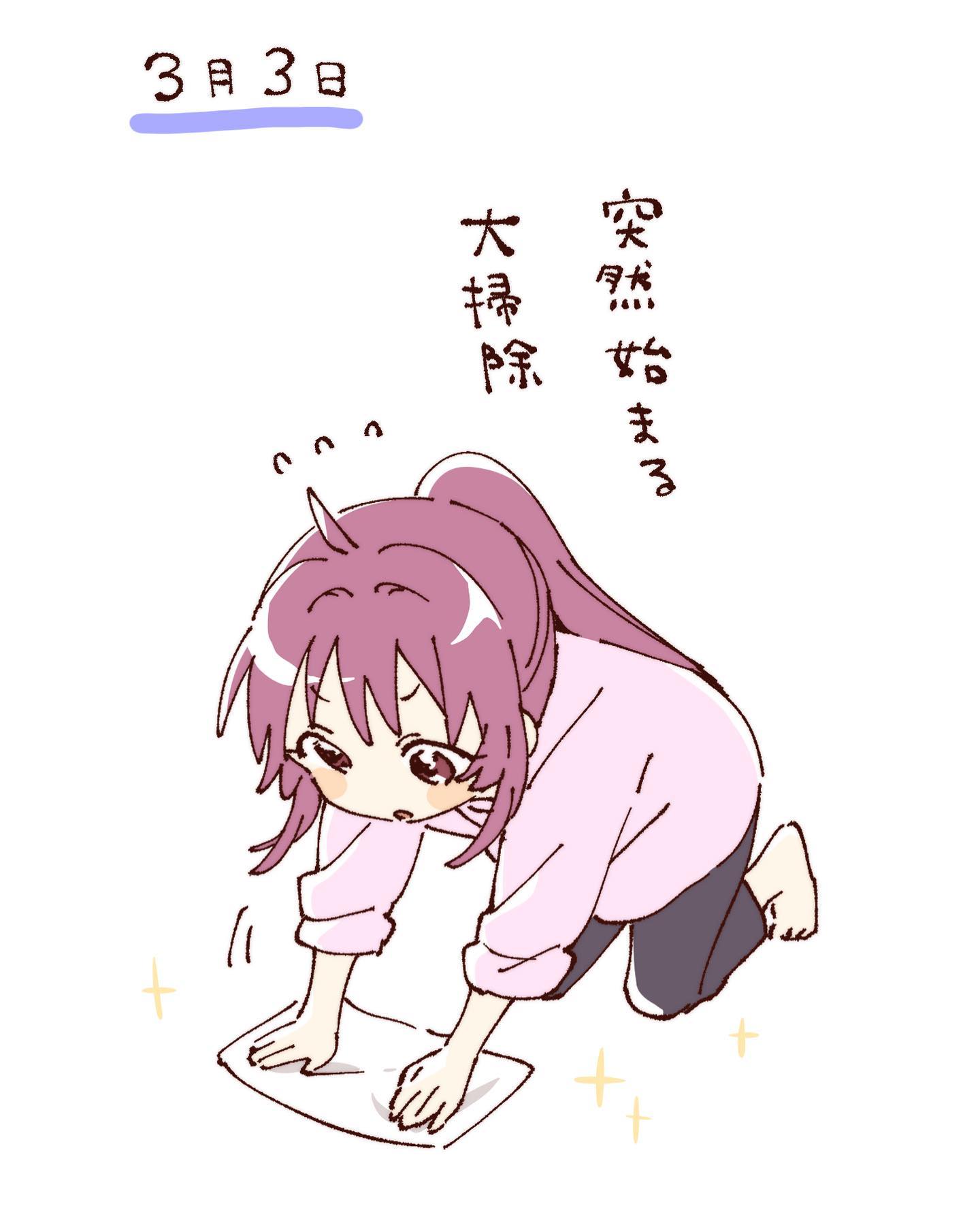 :o1girlahogebarefootblack pantsblush stickerscleaningflying sweatdropsfull bodylong hairlong sleevesopen mouthpantspink shirtponytailpurple eyespurple hairshirtsimple backgroundsolosparkletowelv-shaped eyebrowswhite background