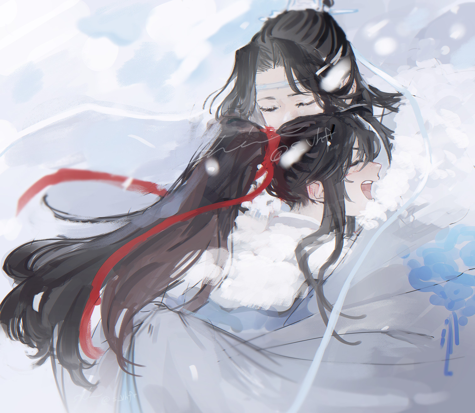 otoki raku, fujibayashi kyou, clannad, 00s, 1girl, blush, breasts, cleavage, female focus, hair intakes, hair ribbon, long hair, no bra, open clothes, open shirt, purple eyes, purple hair, ribbon, ruffling hair, shirt, solo