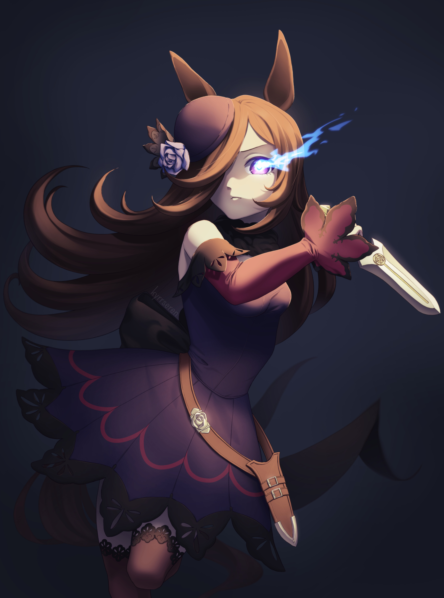 1girlanimal earsbare shouldersblack thighhighsblue dressblue flowerblue hatblue rosebreastsbrown hairclosed mouthdaggerdressfascinatorflipped hairflowerglowingglowing eyeshair over one eyehathat flowerholdingholding daggerholding knifeholding weaponhorse earshorse girlhorse tailknifekyrrserenlong hairlong sleeveslooking at vieweroff shoulderoff-shoulder dresspurple dresspurple eyesrosesimple backgroundsolotailthighhighstilted headwearweapon