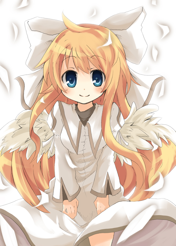 1girlangel wingsblonde hairblue eyesblushcowboy shotdressfemale focuslong hairlong sleeveslooking at viewersimple backgroundsmilesolostandingvery long hairwhite backgroundwhite dresswings