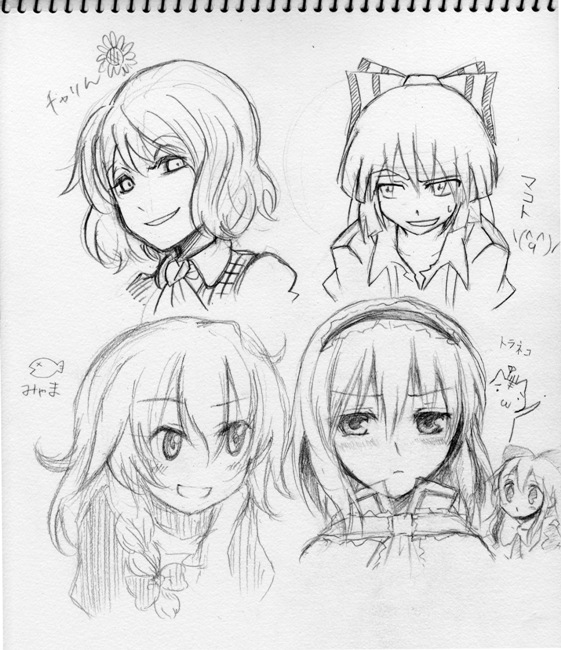 luna lia, nekomiya nono, yotsunoha, graphite (medium), traditional media, translation request, 00s, 1girl, beret, blush, bow, female focus, hat, monochrome, nyan, school uniform, serafuku, short hair, sketch, smile, solo
