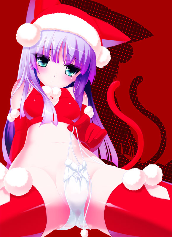 1girlanimal earsblushbreastscat earschristmasfemale focuslong hairpantiespurple hairsanta costumeside-tie pantiessmall breastssolothighhighsunderwear