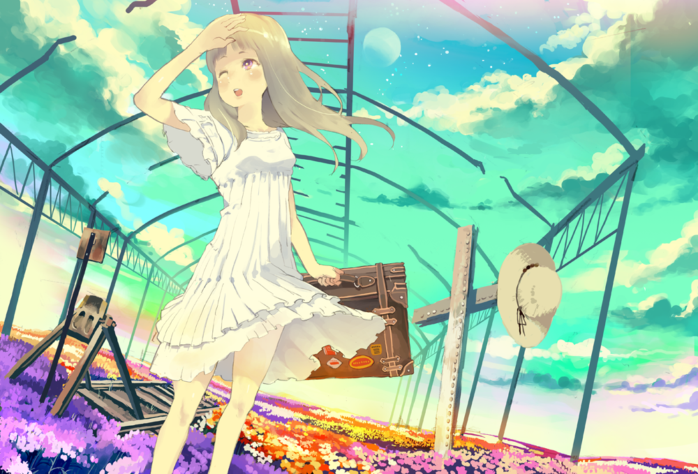 1girlblonde hairclouddayfemale focusfieldflowerflower fieldhatlong hairmoonone eye closedopen mouthpurple hairrailroad tracksruinsshading eyesskirtskysolostandingstar (symbol)suitcasewhite skirtwindwind liftwink