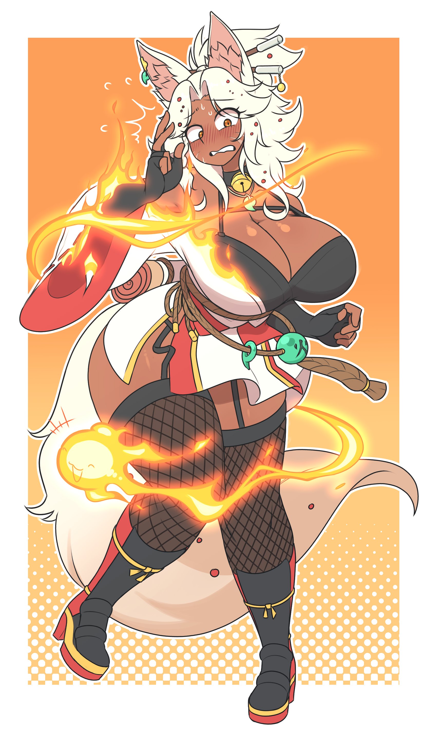1girlanimal earsbare shouldersbellblack chokerblack glovesblushbootsbrabreastschokercleavagecollarcontrappostodark skindynamic poseelbow glovesembarrassedfangfingerless glovesfirefishnet thighhighsfishnetsflusteredfox earsfox girlfox tailfull bodygarter strapsgloveshair ornamenthuge breastsjapanese clothesjewelrykimonokitsuneknee bootslong hairlooking at viewermessy hairneck bellnervoussolostandingstanding on one legsurprisedtailtanthick thighsthighhighsthighsunderwearwhite hairyellow eyes