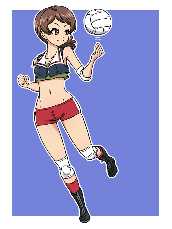 1girlblue backgroundblushbreastsbrown eyesbrown hairburumaclosed mouthcollarbonefull bodylong hairmilitary uniformnavelooarai military uniformponytailred burumasimple backgroundsmall breastssmilesolosportswearvolleyballvolleyball uniform
