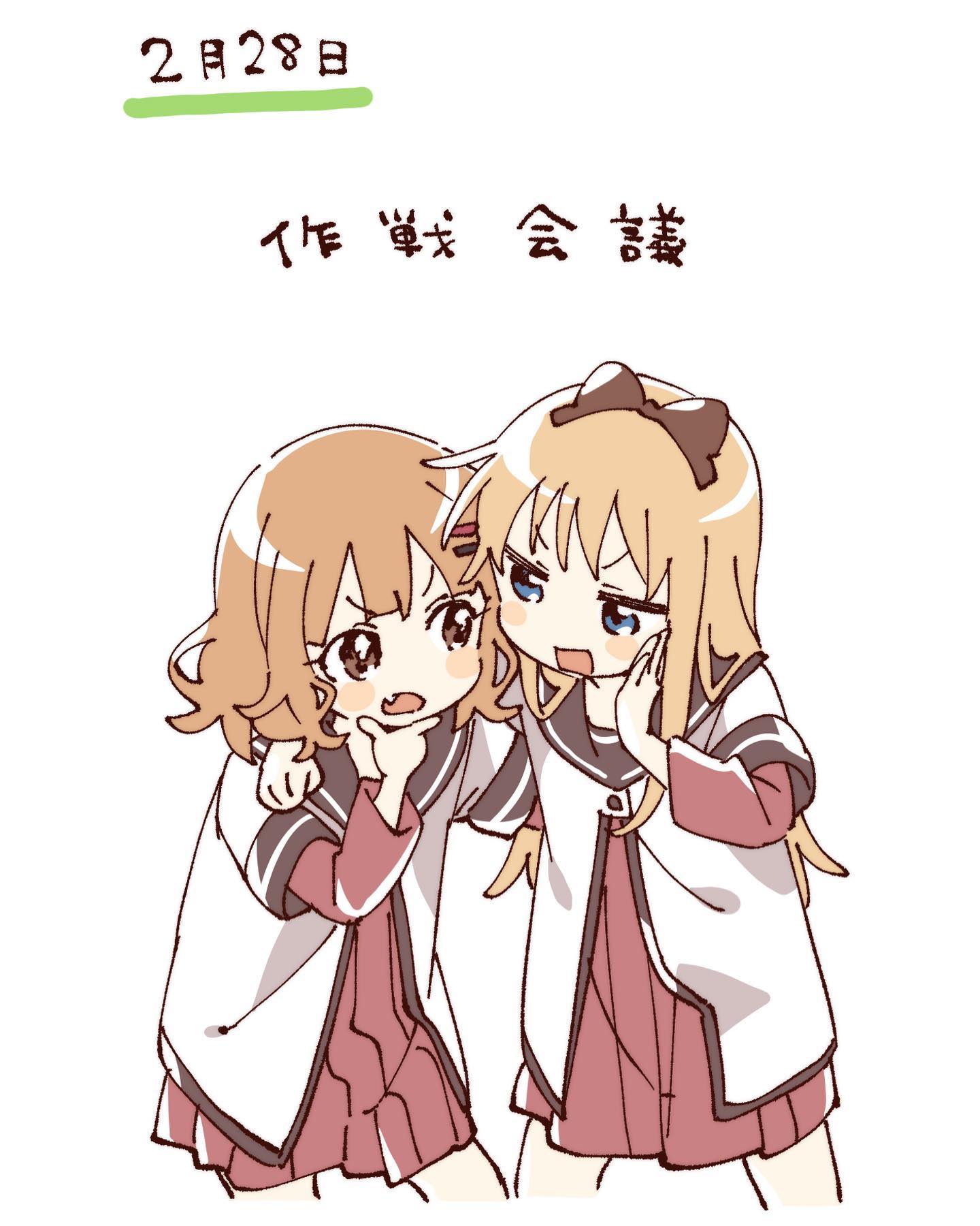 2girlsblonde hairblue eyesblush stickersbowbrown bowbrown eyesbrown hairbrown sailor collarcropped legsdressfanghair bowhair ornamenthaircliphand uplayered sleeveslong hairlong sleevesmultiple girlsnanamori school uniformopen mouthparallel hairclipspleated dressred dresssailor collarschool uniformshirtshort hairshort over long sleevesshort sleevessimple backgroundstandingv-shaped eyebrowswhite backgroundwhite shirtwinter uniform
