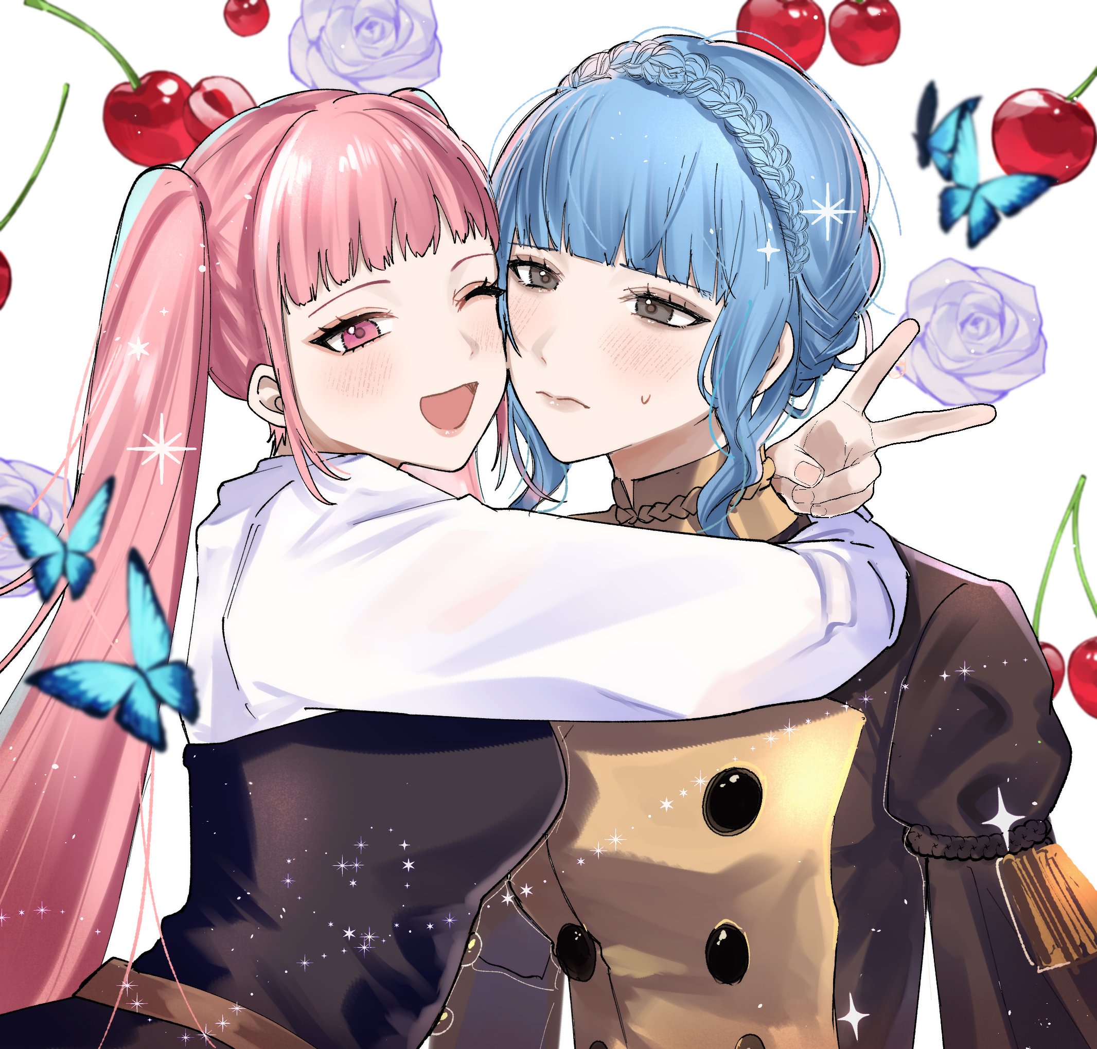 kamiya yuu, hatsune miku, vocaloid, 1girl, blush, bug, butterfly, colorful, detached sleeves, female focus, green nails, insect, long hair, microphone, microphone stand, multicolored hair, nail polish, necktie, solo, thighhighs, twintails, very long hair