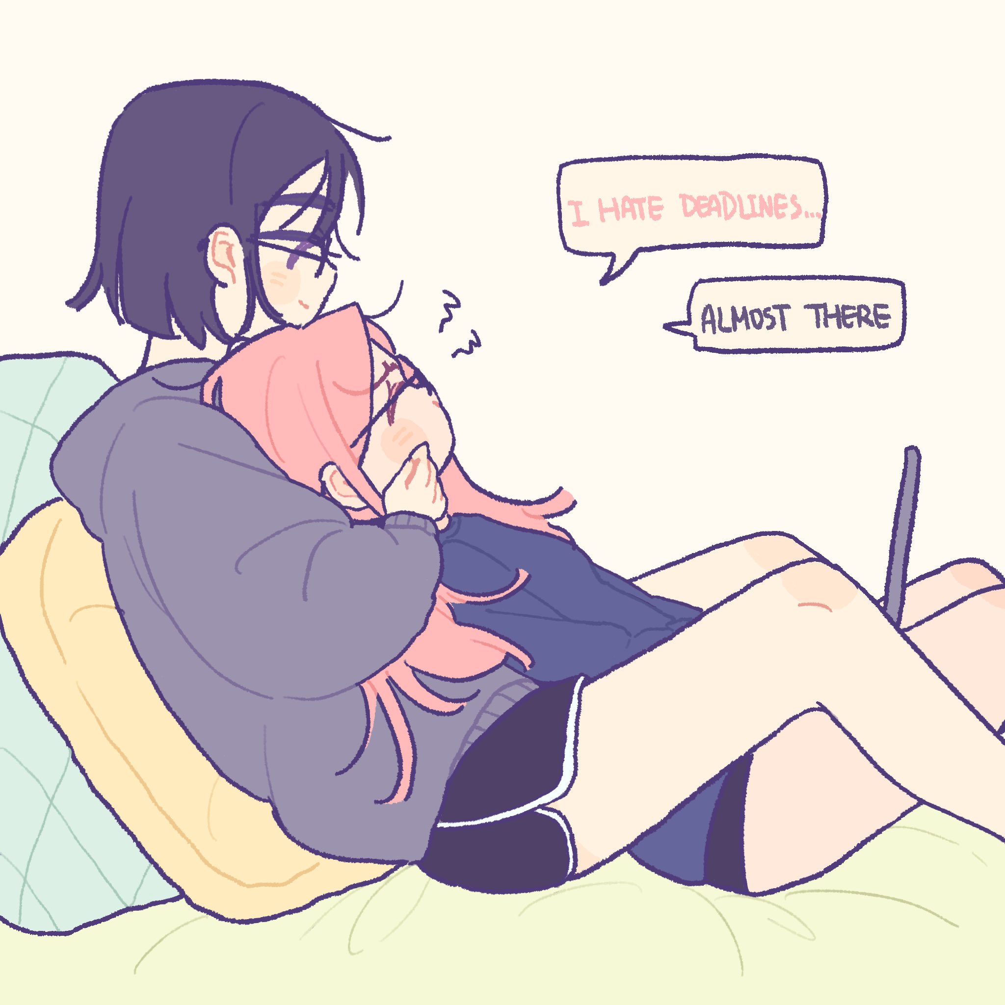 toomishou, aozaki aoko, shizuki soujuurou, mahou tsukai no yoru, absurdres, highres, 1boy, 1girl, black hair, black sweater, blue sweater, brown hair, closed eyes, couch, cuddling, cushion, hair intakes, hand on another's back, hand on another's neck, light blush, long hair, lying, lying on another, on back, pillow, short hair, smile, sweater, turtleneck, turtleneck sweater