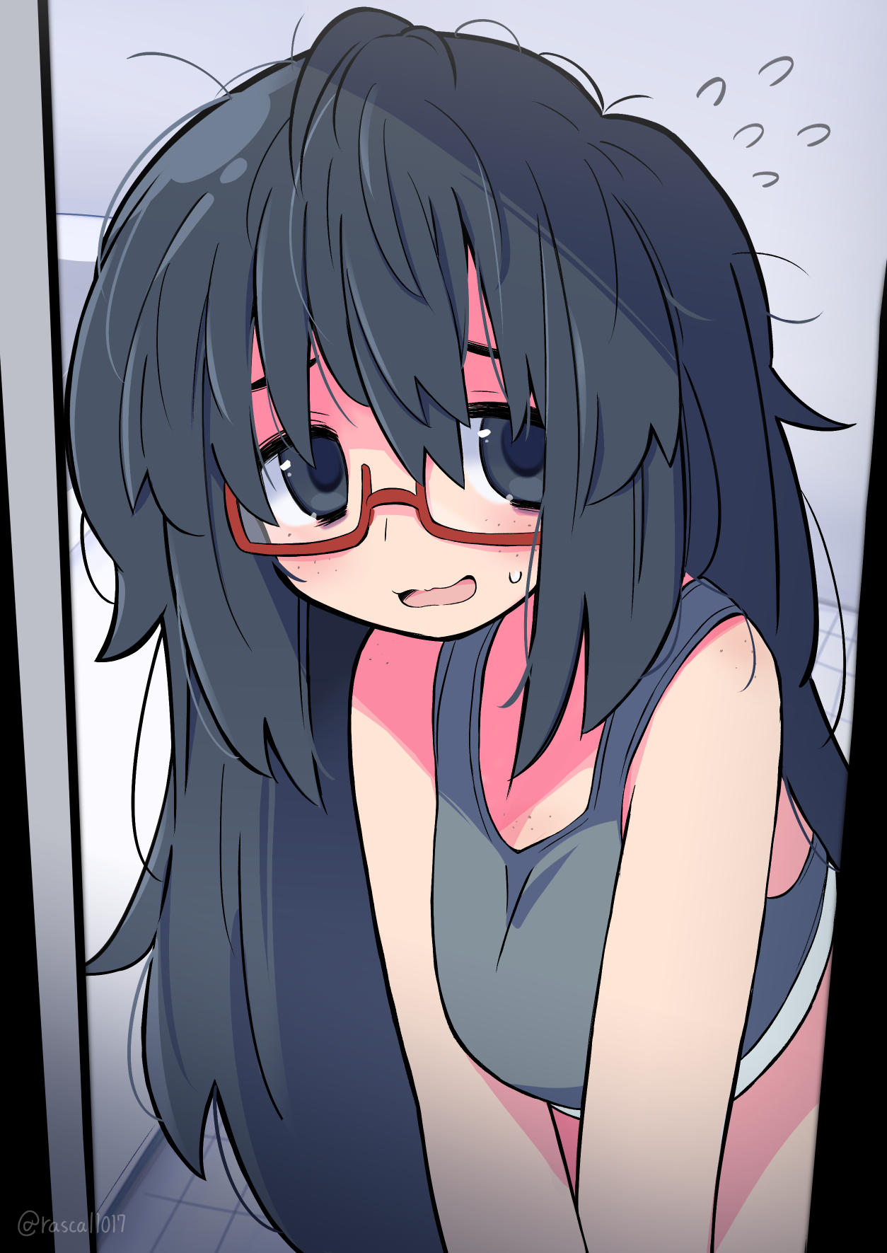1girlblack eyesblack hairblushdoorwayflying sweatdropsfollower (rascal)frecklesgrey sports brahair downjimikolooking at viewermessy hairopen mouthpov doorwayred-framed eyewearsolosports brasweatdroptwitter username