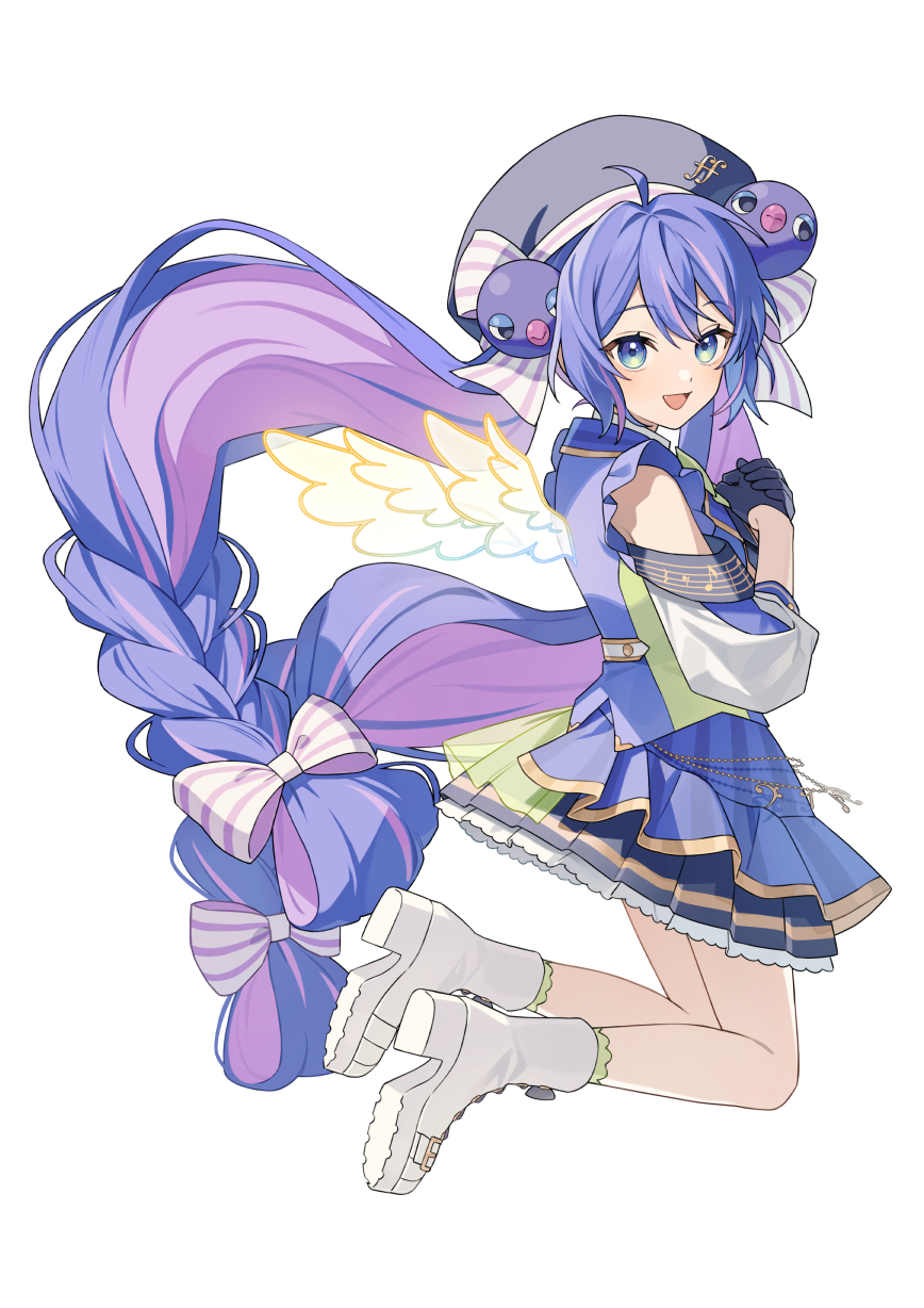 :d1girlblack glovesblue eyesblue skirtbootsbowbraidclothing cutoutfloating hairfrom sidefull bodyglovesgrey hathatjacketlong hairminiskirtmulticolored hairopen mouthpink hairpleated skirtpurple hairpurple jacketshoulder cutoutsimple backgroundskirtsmilesolostriped bowtwintailstwo-tone hairvery long hairwhite backgroundwhite bootswhite bow