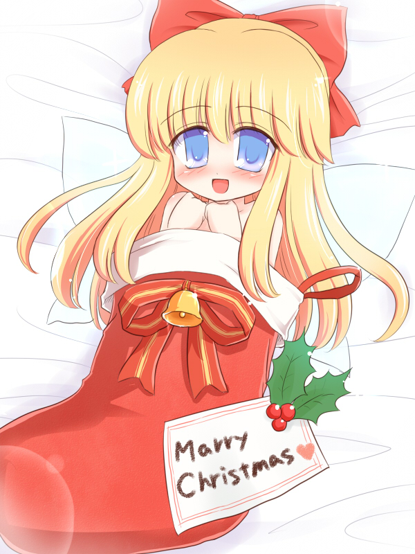 1girlbellblonde hairblue eyesblushchristmaschristmas stockingenglish textengrish textfemale focushair ribbonlong hairnudeopen mouthranguageribbonsmilesolowings