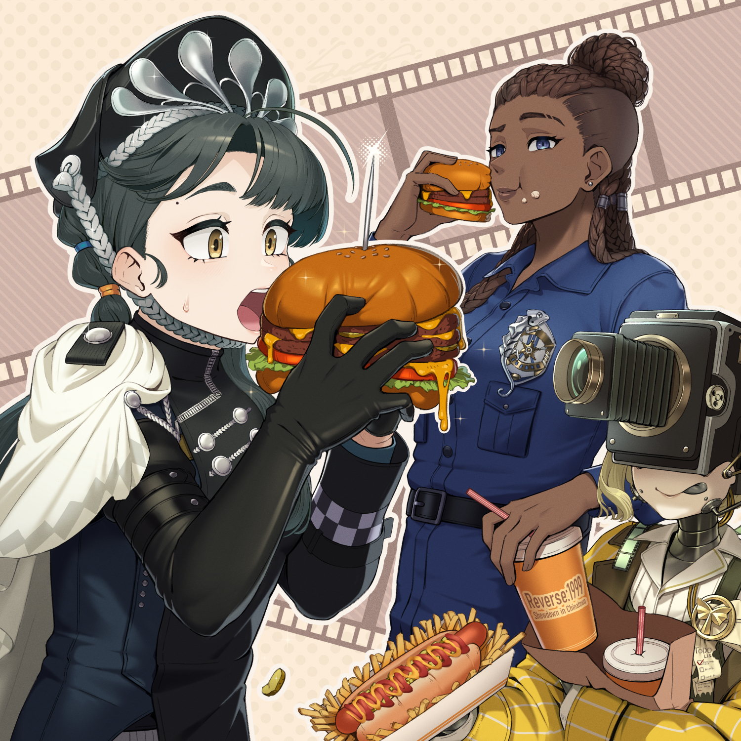 i-nn, ako (blue archive), hina (blue archive), kasumi (blue archive), satsuki (blue archive), blue archive, highres, translation request, 3girls, ahoge, black coat, breasts, brown hair, coat, coat on shoulders, crying kasumi (blue archive) (meme), demon girl, demon horns, halo, horns, long hair, meme, mole, mole on breast, multiple girls, pink hair, purple eyes, red eyes, simple background, standing, upper body, very long hair, white hair
