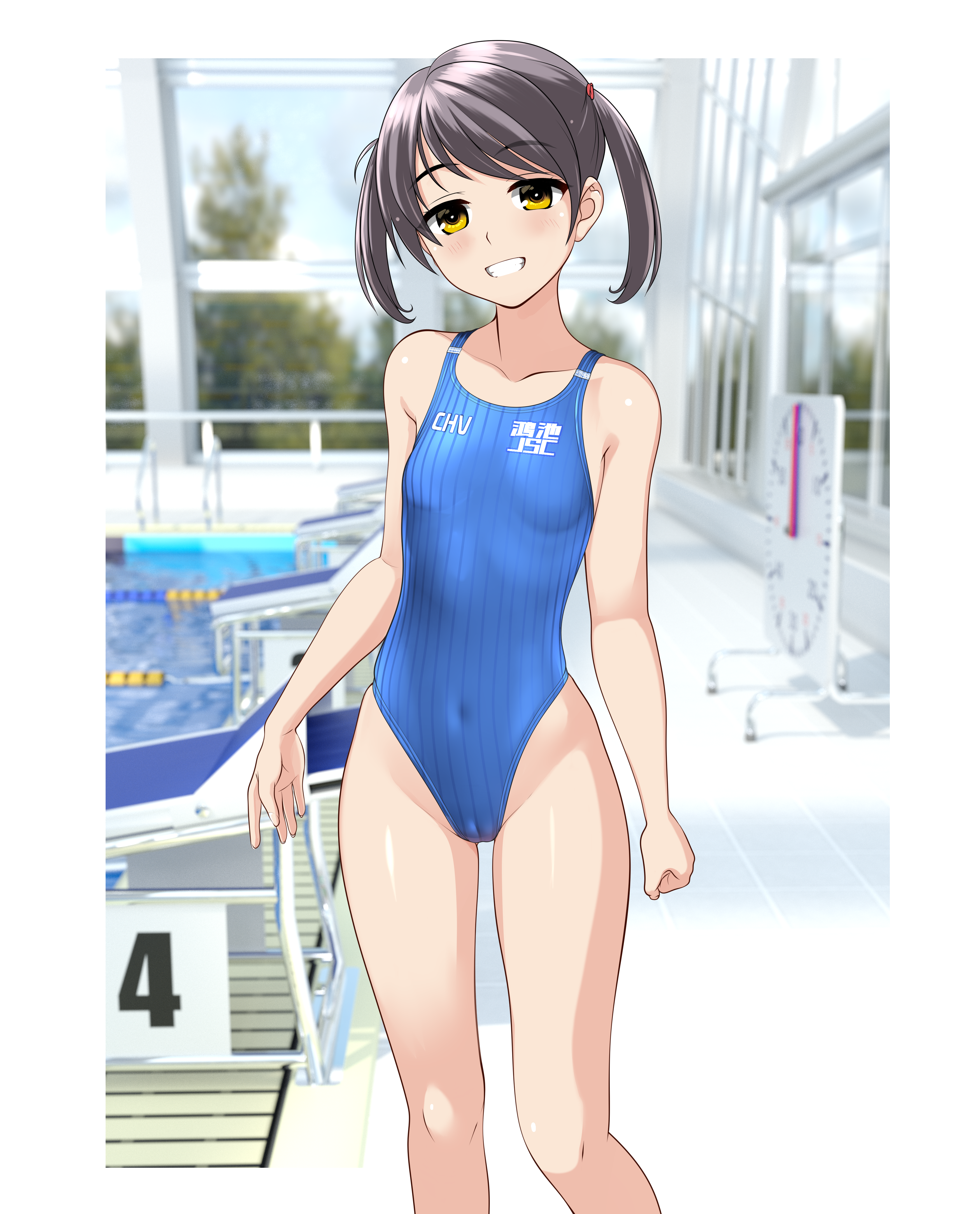 1girlblack hairblue one-piece swimsuitbreastsbrown eyescameltoecovered navelfeet out of framehighleghighleg one-piece swimsuitindoorsone-piece swimsuitparted lipspoolsmall breastssmilesolostarting blockstriped clothesstriped one-piece swimsuitswept bangsswimsuit