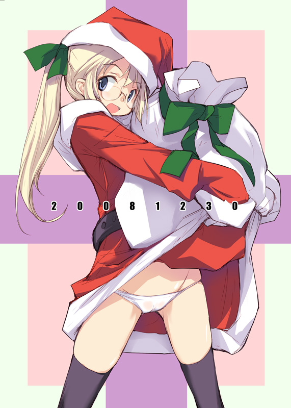 blonde hairblue eyesclothes liftglasseslong hairlowleglowleg pantiespantiessanta costumeskirtskirt liftsolothighhighstwintailsunderwear