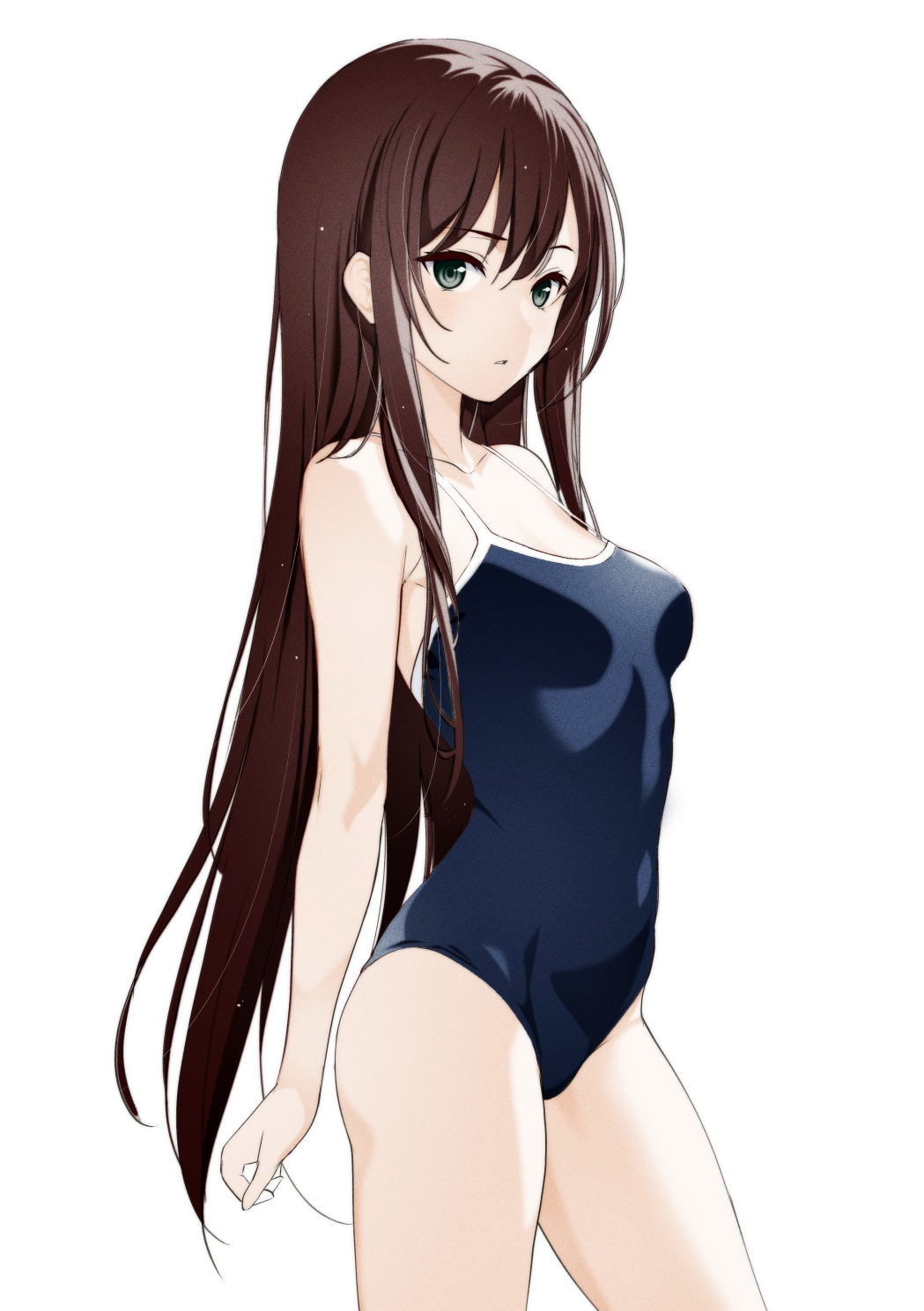 1girlarm at sidearmpit creaseblue one-piece swimsuitbreastsbrown hairchoppy bangscollarbonecowboy shotexpressionlessfrom sidegrey eyeslong hairlooking at viewerlooking to the sidemedium breastsone-piece swimsuitparted lipssimple backgroundsolostandingstraight hairswimsuitvery long hairwhite background