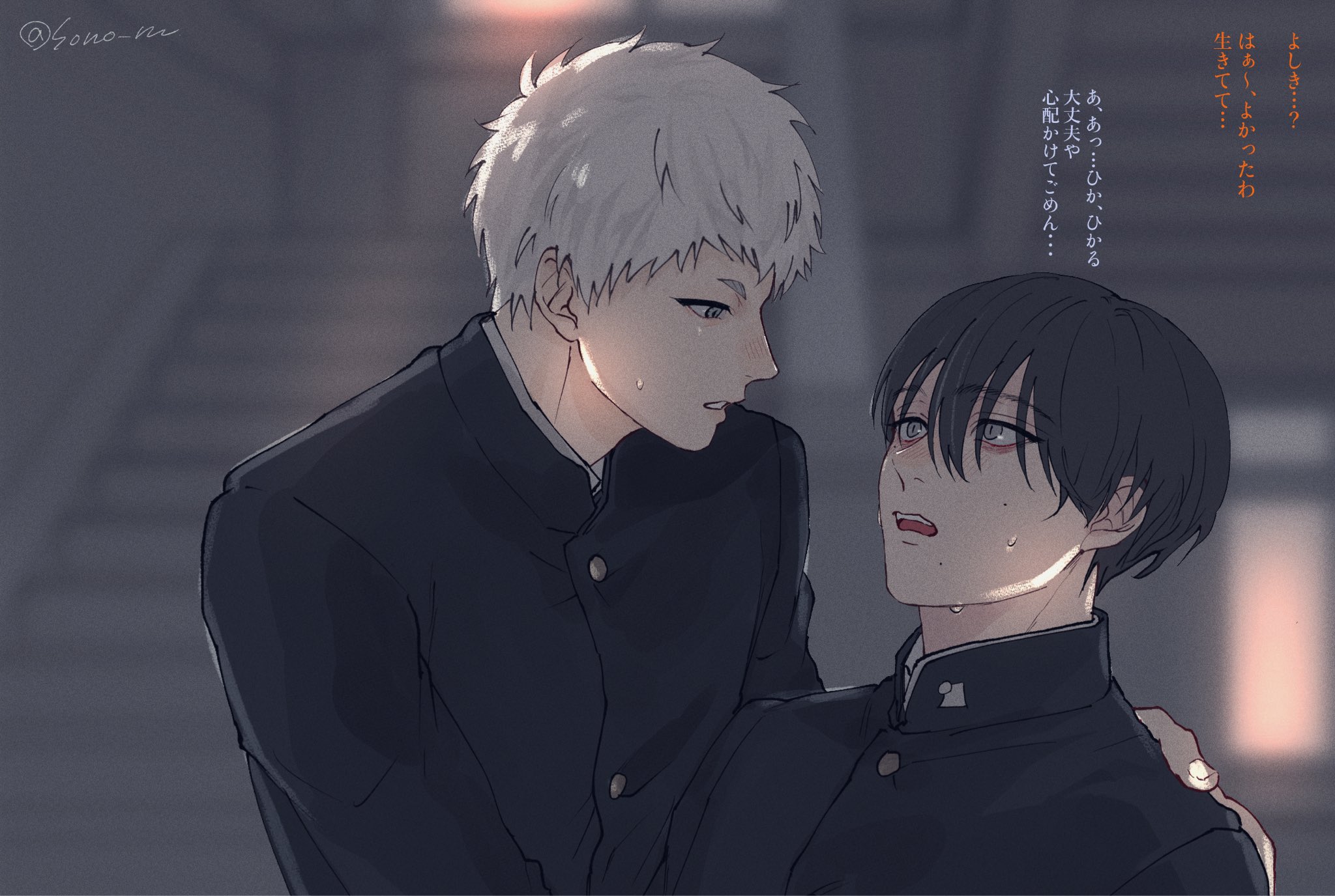 2boysbags under eyesblack hairblurryblurry backgroundblushbuttonsgakuranlooking at anothermale focusmolemole on cheekmole under eyemole under mouthmultiple boysmultiple molesopen mouthschool uniformshort hairteethtwitter usernameupper bodywhite hair