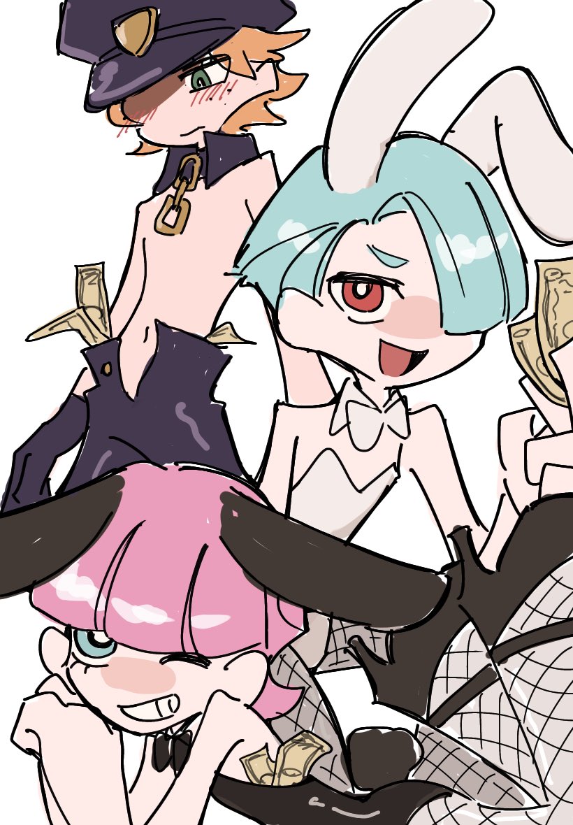 3boysanimal earsblue eyesblue hairblunt bangsblushbowbowtiebrothersfishnetsfrecklesgirly boygreen eyesgrinhair over one eyehatholdingholding moneymale focusmale playboy bunnymoneymultiple boysnavelorange hairpink hairpolice hatrabbit earsred eyesshort hairsiblingssimple backgroundsmileteethtopless malewhite background