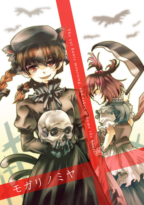 etogami kazuya, nagae iku, remilia scarlet, touhou, 2girls, :o, ascot, blue skirt, capelet, dress, female focus, flying, frills, hat, mob cap, multiple girls, open mouth, puffy short sleeves, puffy sleeves, purple hair, red eyes, short hair, short sleeves, skirt, white dress