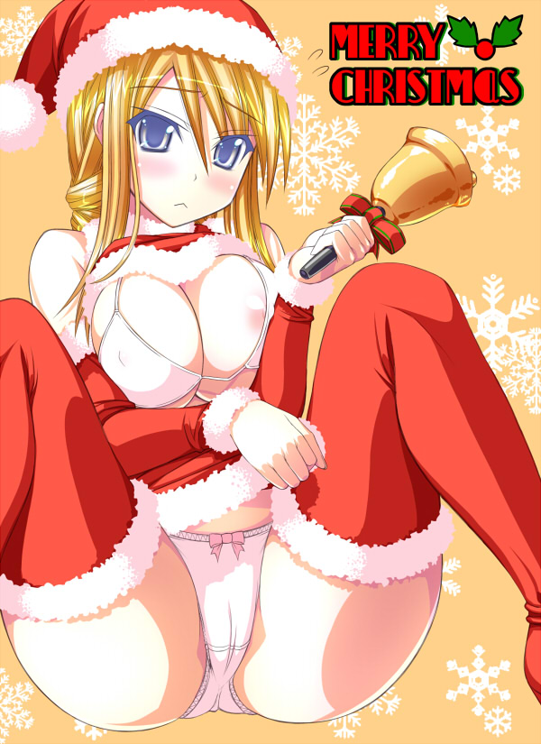 1boy1girlareola slipbellblonde hairblushbrabraidbreastscameltoecovered erect nipplesfemale focushatlarge breastslingeriemidriffnipple slipnipplespantiessanta costumesanta hatsingle braidsnowflakessolospread legsthighhighsunderboobunderwear
