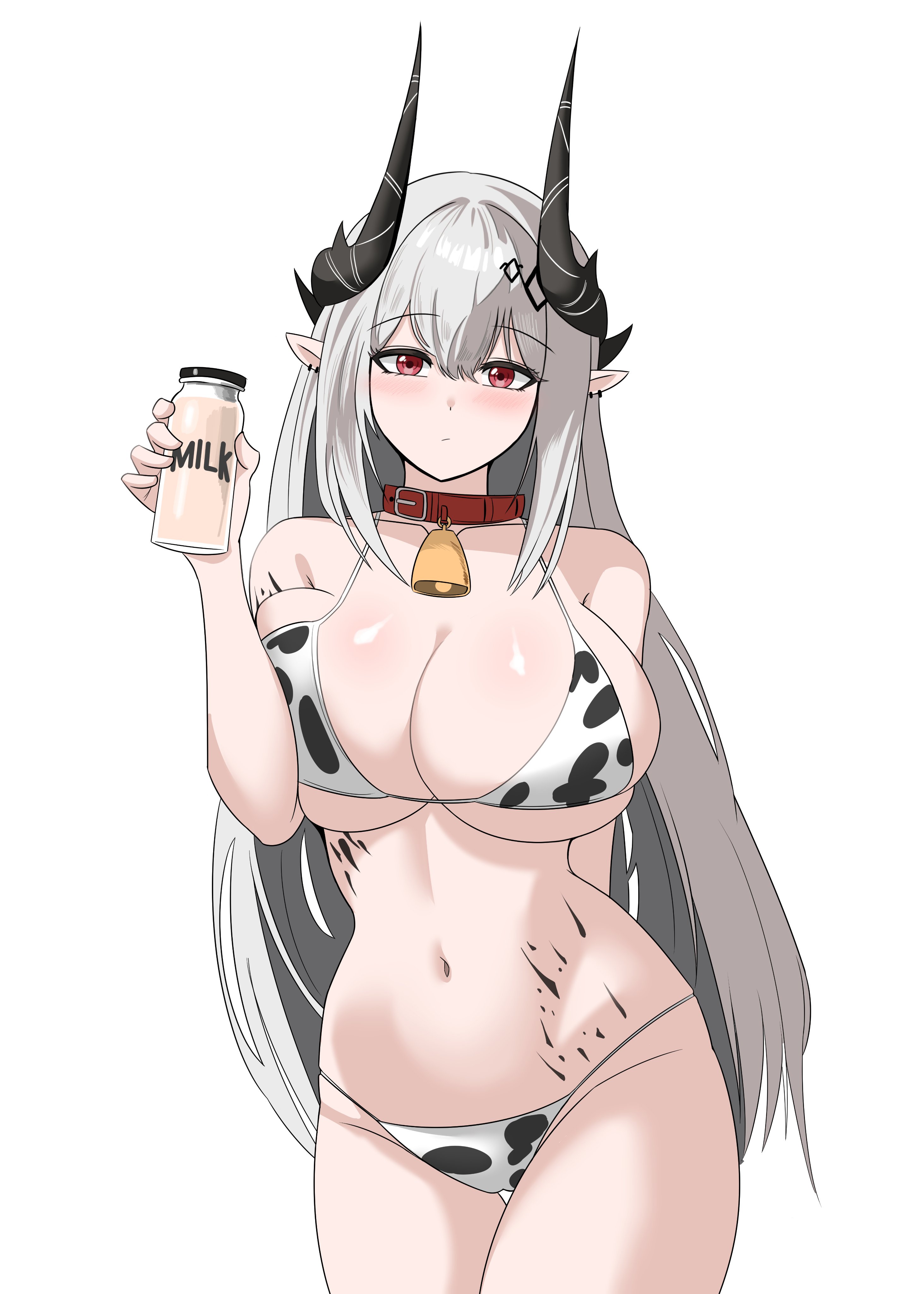 1girlanimal printbare shouldersbellbikiniblack hornsbottlecow printcow print bikinicowbellcowboy shotdemon girldemon hornsgrey hairholdingholding bottlehornslong hairlooking at viewermaterial growthmilk bottlenaveloripathy lesion (arknights)pointy earsprint bikinired eyessimple backgroundsolostomachswimsuitthighsvery long hairwhite background