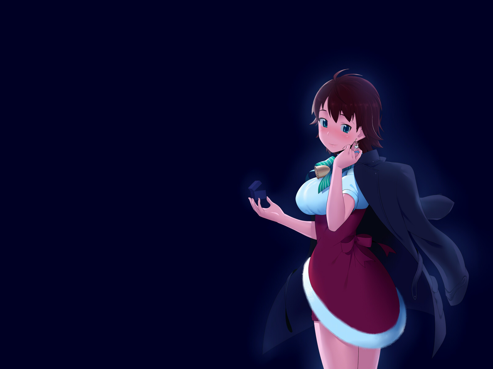 00s1girlblue eyesblushbreastsbrown hairchristmasdarkearringsfemale focusgradient backgroundjewelrysanta costumeshort hairsmilesolo