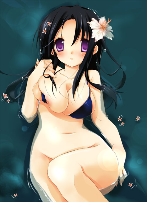 00s1girlbikiniblack bikinibottomlessbreastsfemale focusflowerhair flowerhair ornamenthibiscuslong hairnipplespurple eyessoloswimsuitwater